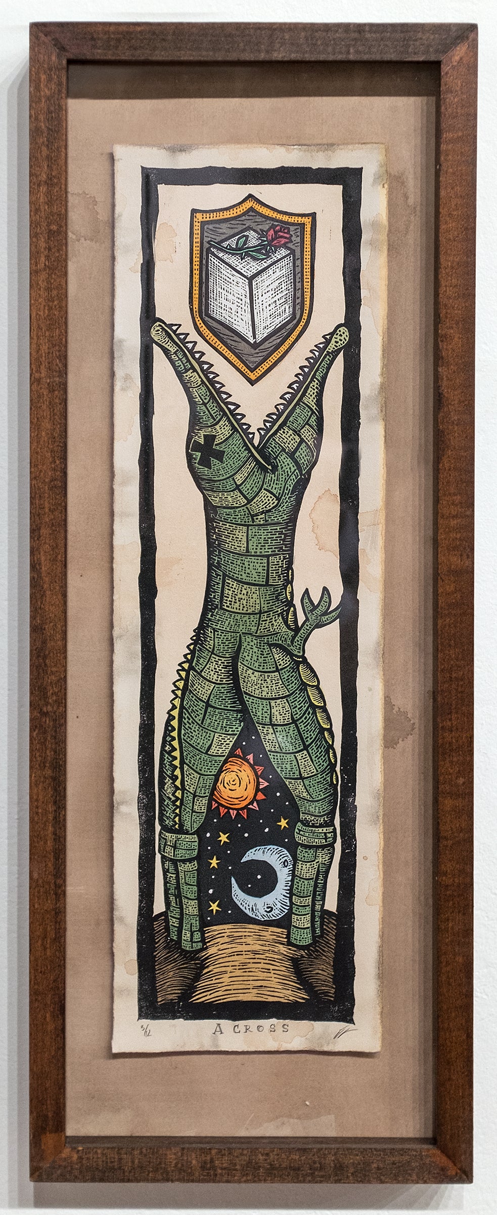 Hand carved woodblock print, hand painted with watercolor on tea treated cotton rag paper, 23.5" x 9”, custom frame, Edition of 12