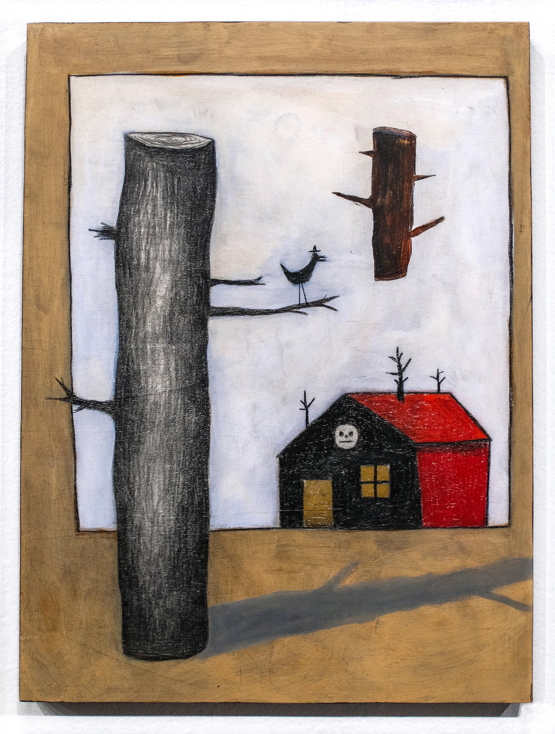 Acrylic, oil pastel, pencil, wax pastel. 16" x 12,” wood panel.