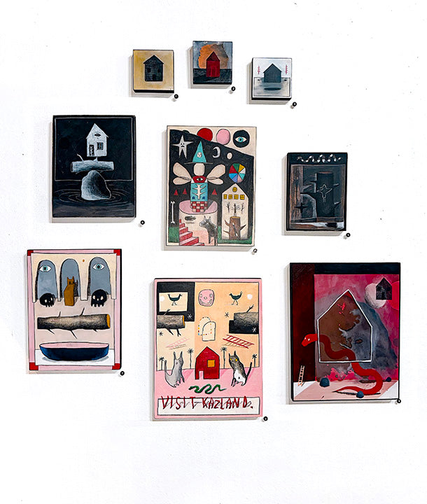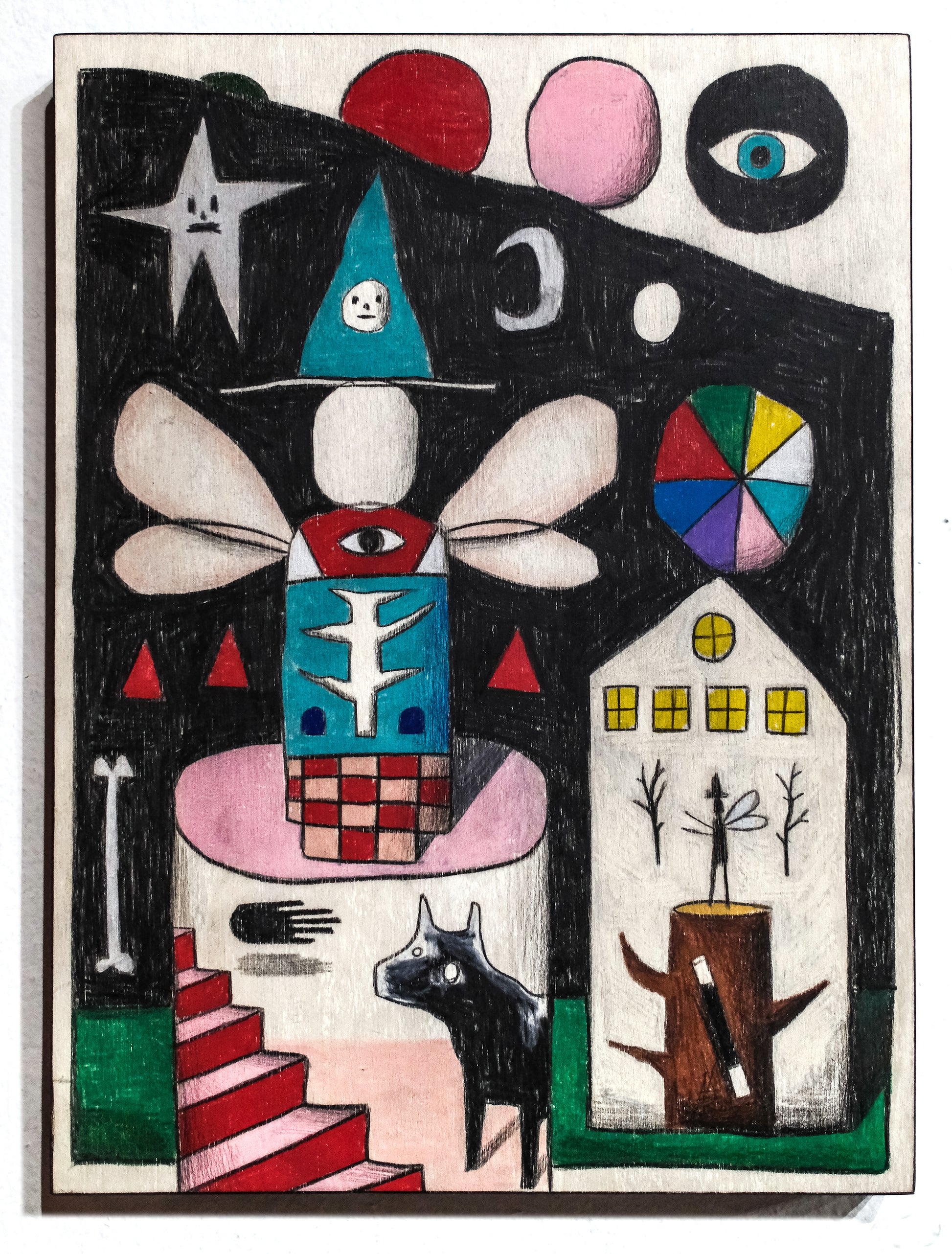 Acrylic, pencil, wax pastel. 12" x 9,” wood panel.