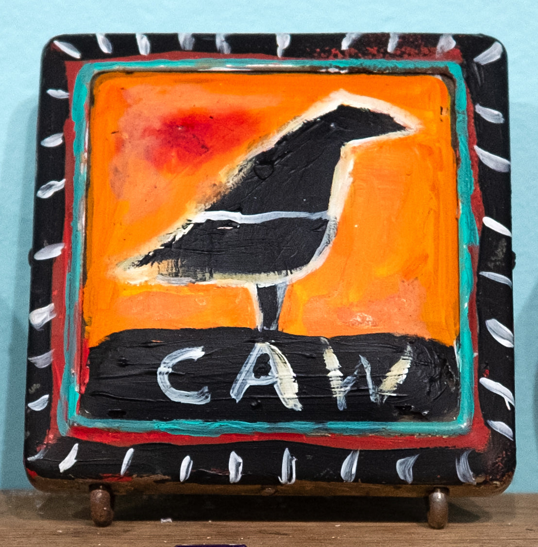 Caw Time no. 3 (right), oil on antique clock, 4.5" 4.5" x 2" 🔴SOLD.