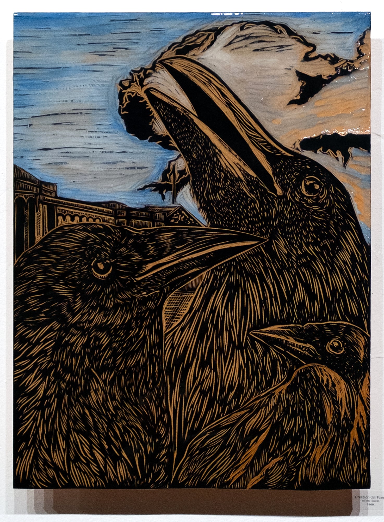 woodblock carving with black ink, oil paint, resin and epoxy, 24" x 18"