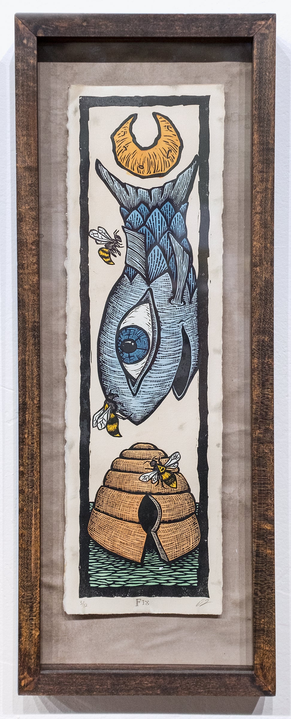 Hand carved woodblock print, hand painted with watercolor on tea treated cotton rag paper. 23.5" x 9”, custom frame, Edition of 12