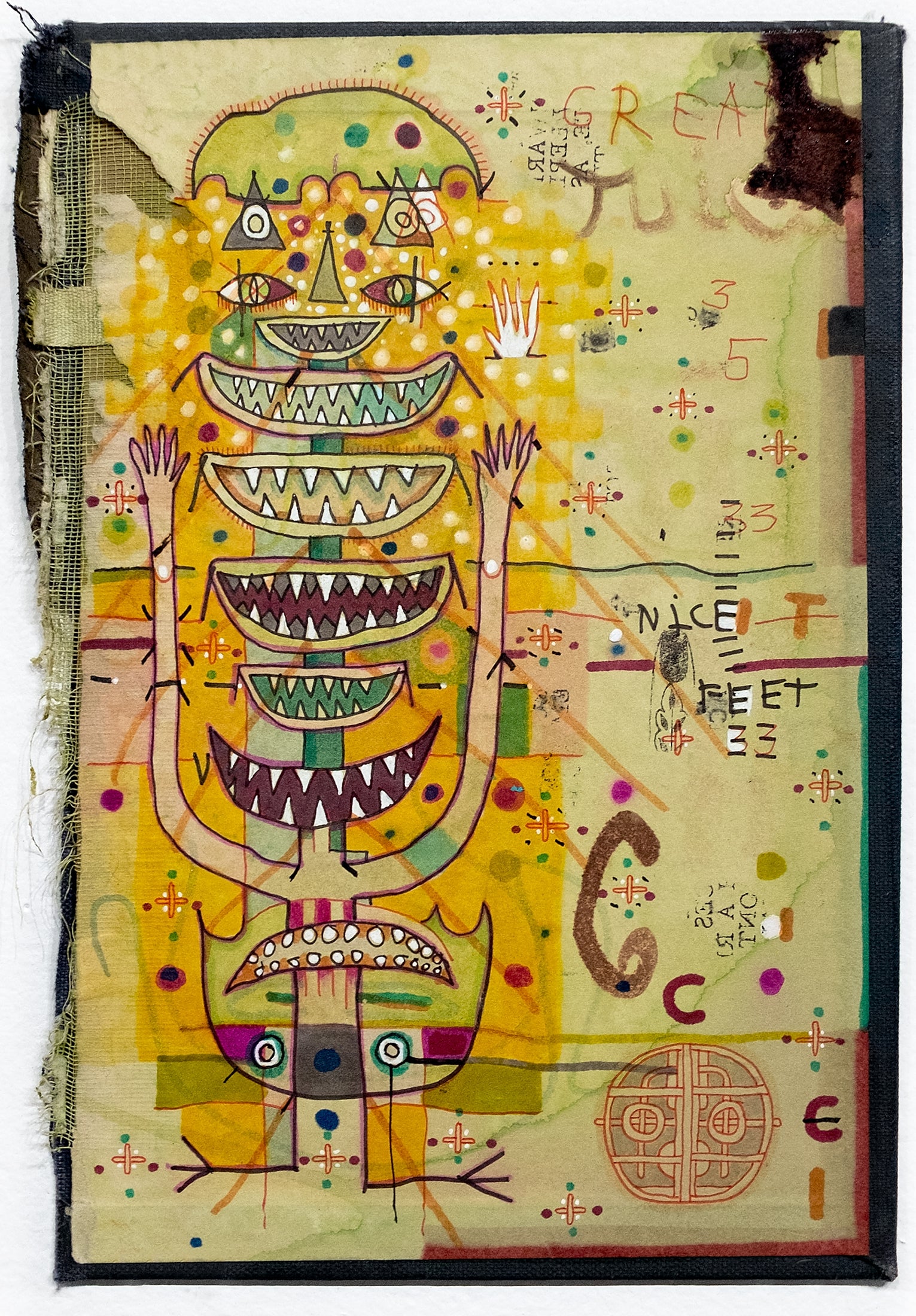 inks the artist mixes from dead pens and markers on vintage bookcover, 8 x 9in
