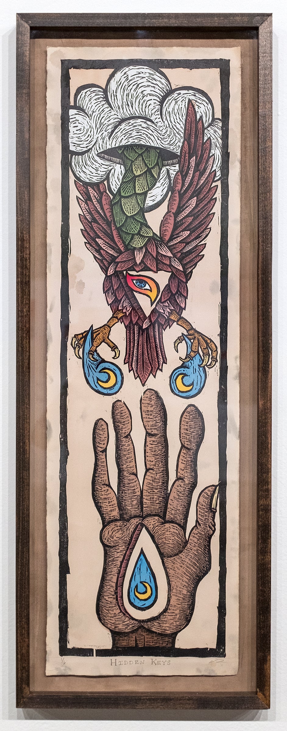 Hand carved woodblock print, hand painted with watercolor on tea treated cotton rag paper, 40” x 15.5”, custom frame, Edition of 6
