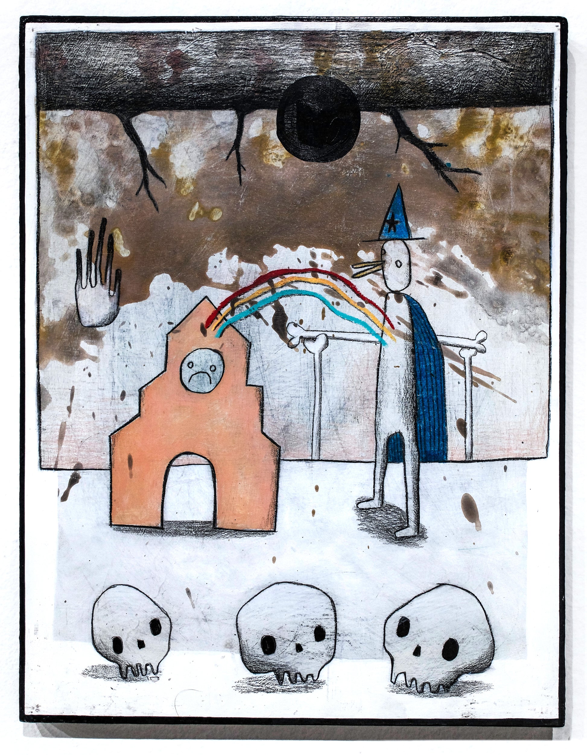 Acrylic, oil pastel, pencil. 14" X 11", wood panel.