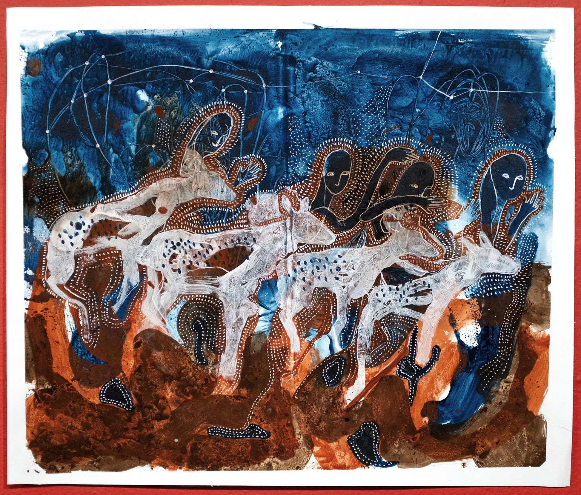 pigments, casein binder, watercolors, inks on art paper, 16.25" x 19.25"