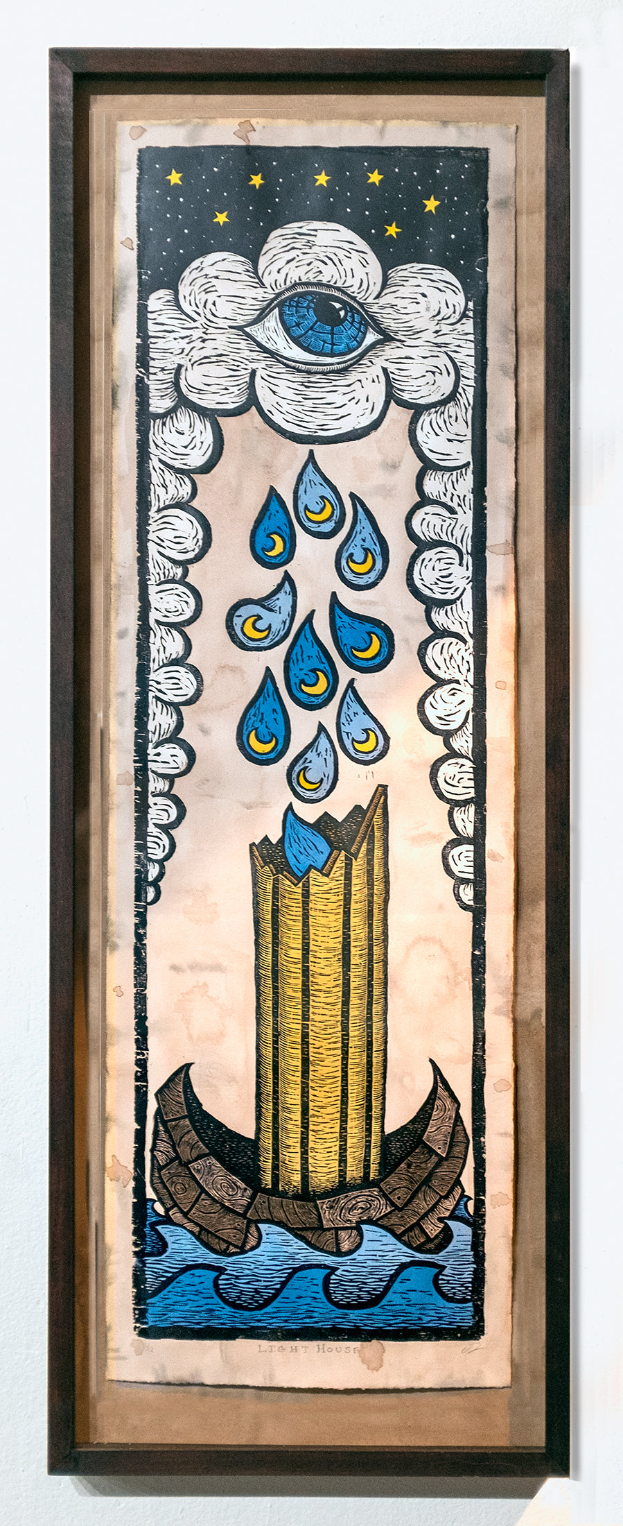 Hand carved woodblock print, hand painted with watercolor on tea treated cotton rag paper. 43 x 16.5”, Edition 12