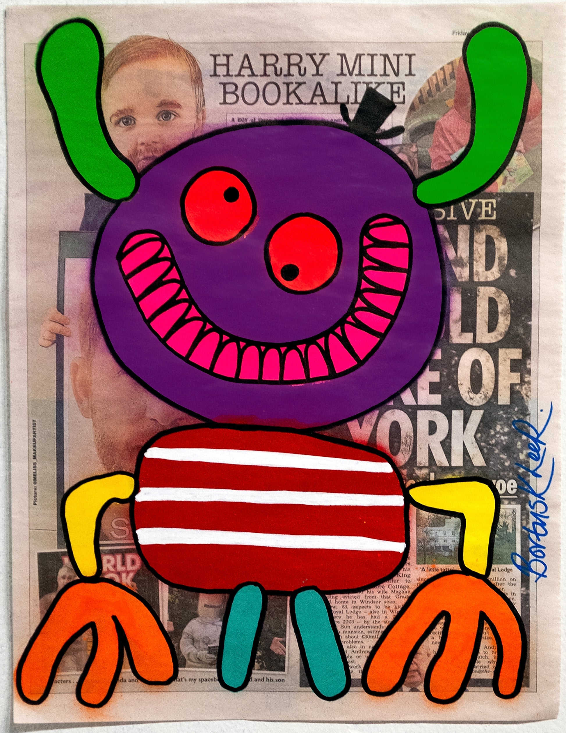 spraypaint, acrylic marker on newspaper, 14.375” x 11.25”, 2023