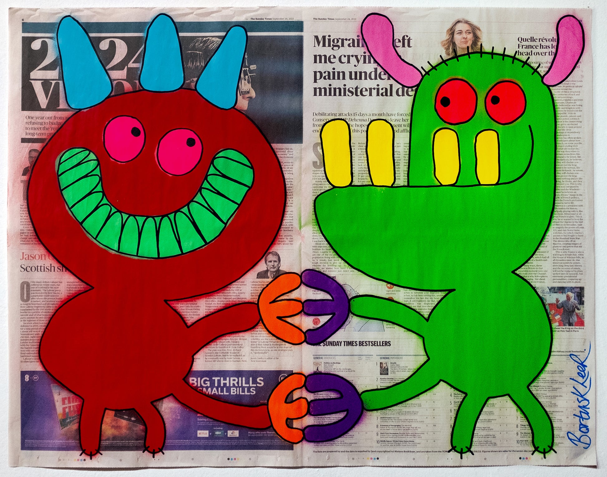 spraypaint, acrylic marker on newspaper, 22.75" x 28.75", 2023