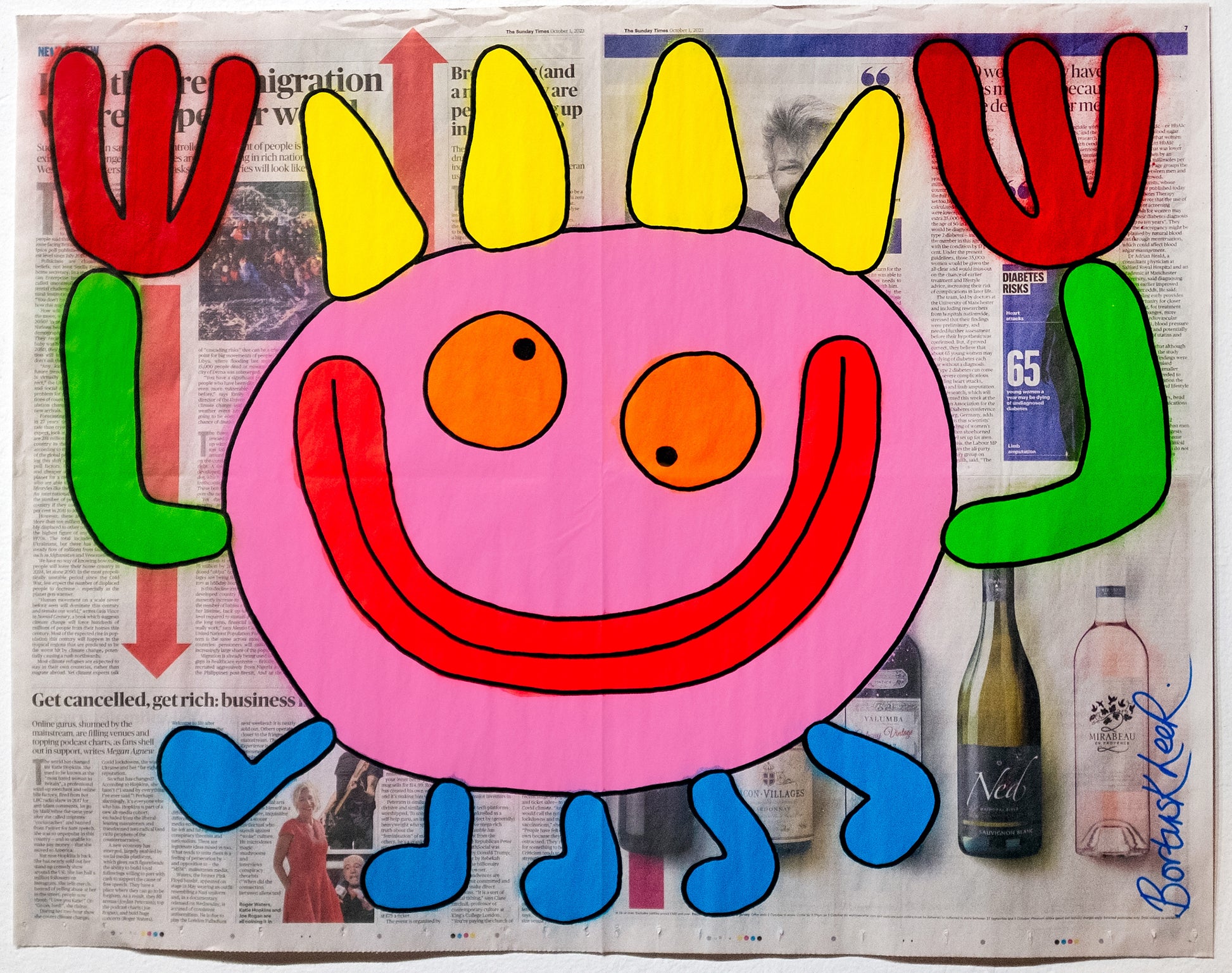 spraypaint, acrylic marker on newspaper, 22.75" x 23.75", 2023