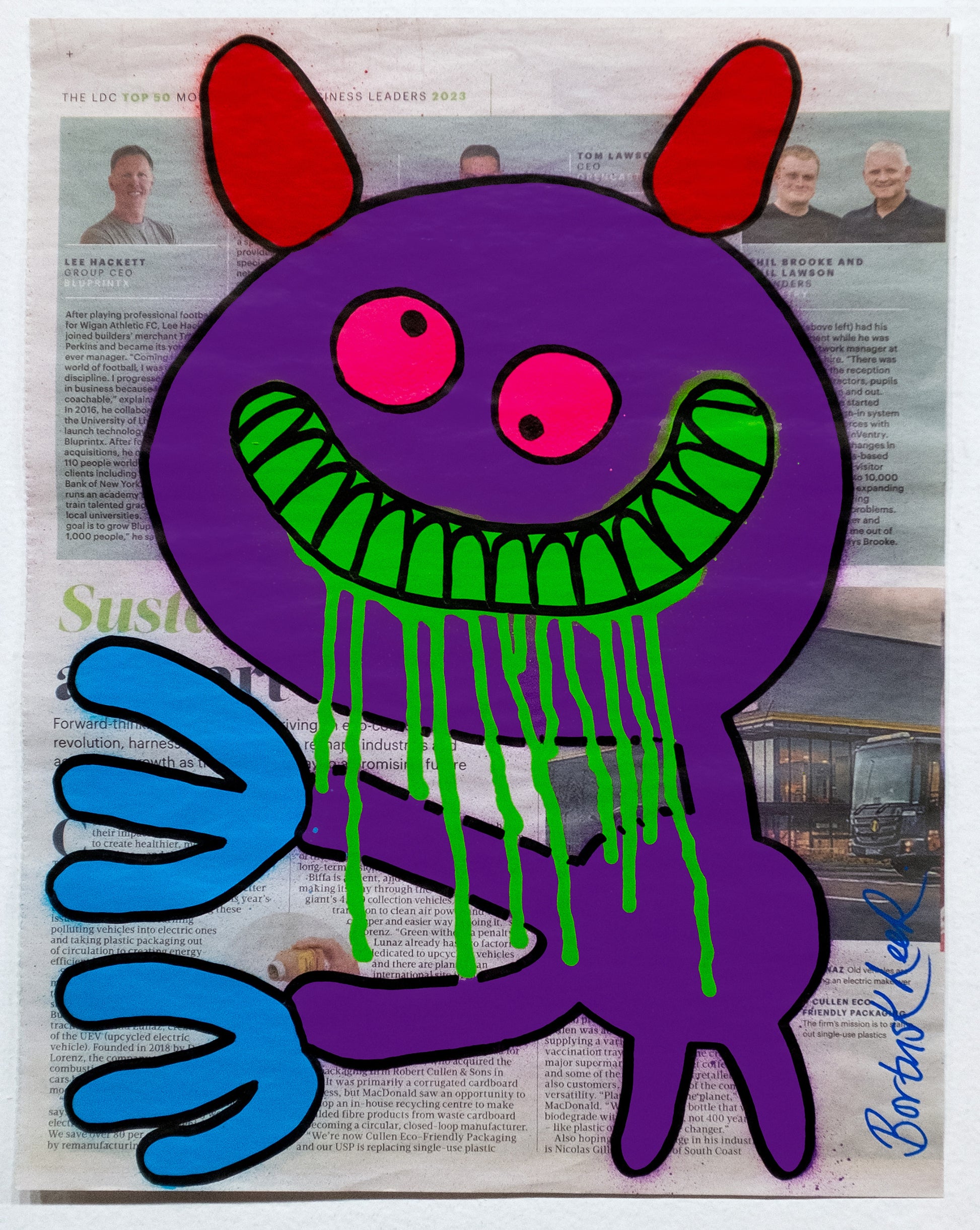 spraypaint, acrylic marker on newspaper, 14" x 11", 2023