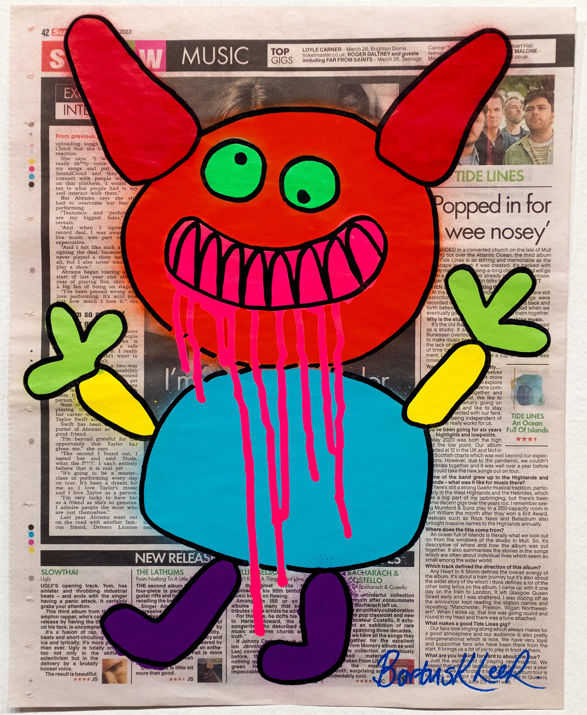 spraypaint, acrylic marker on newspaper, 14" x 11", 2023