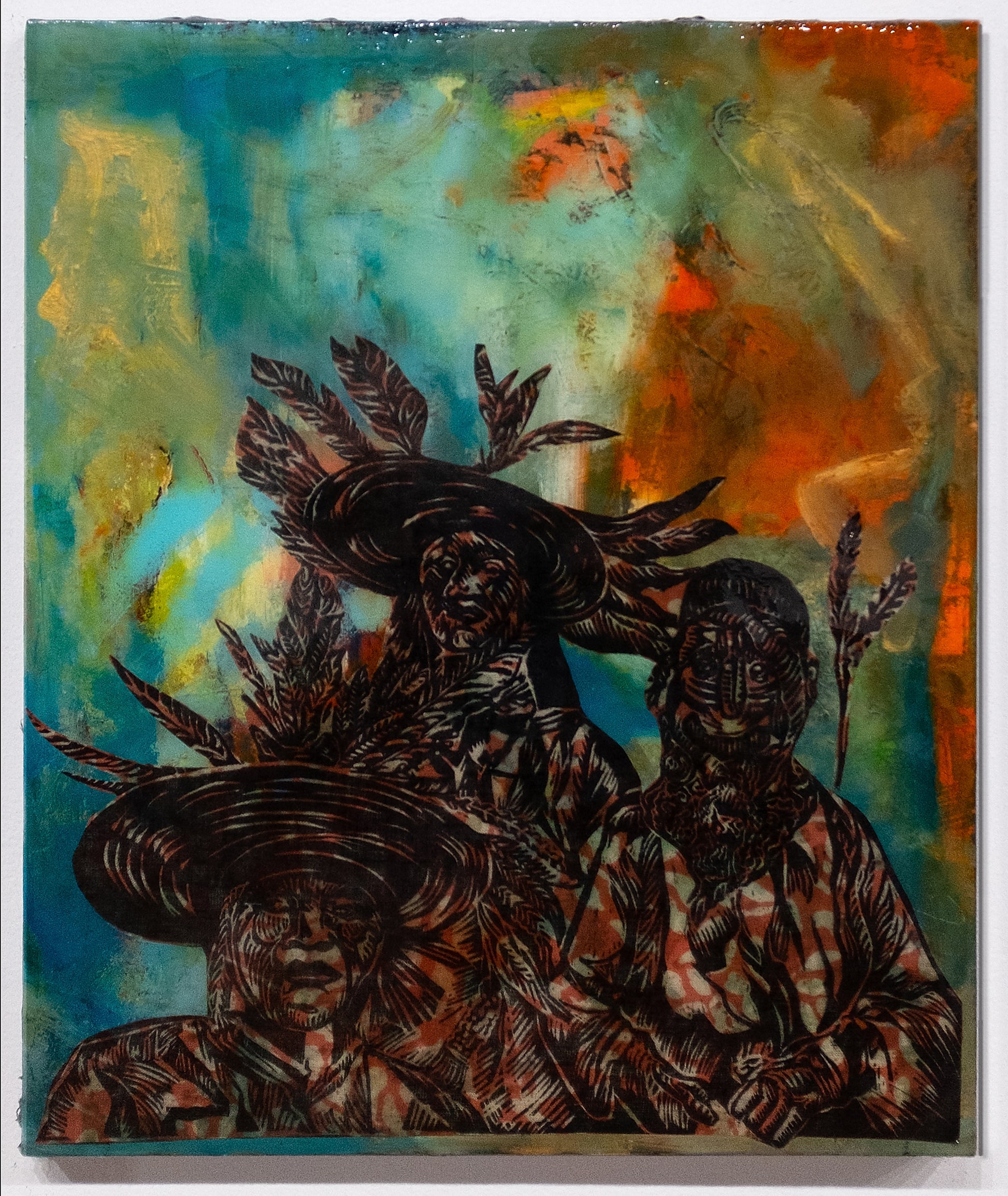 woodblock print on fabric affixed to oil painting on canvas, and resin, 24” 20”