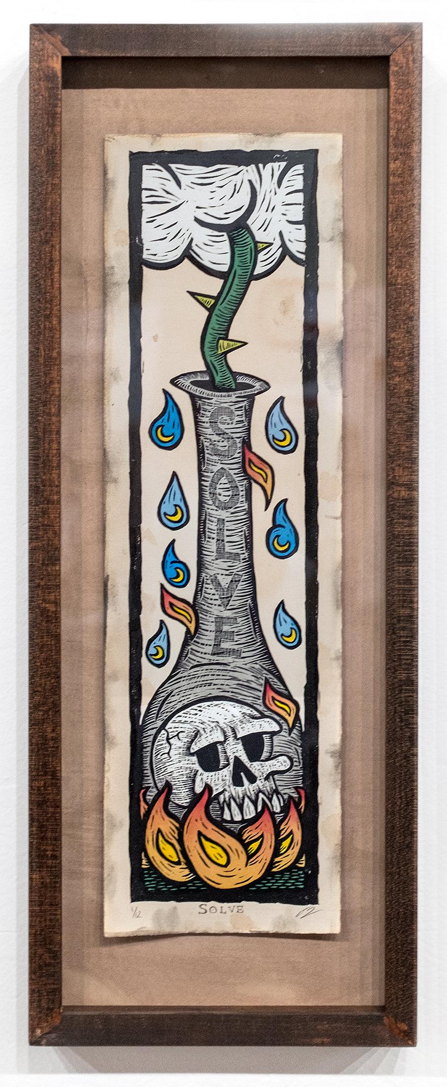 Hand carved woodblock print, hand painted with watercolor on tea treated cotton rag paper, 23.5" x 9”, custom frame, Edition of 12