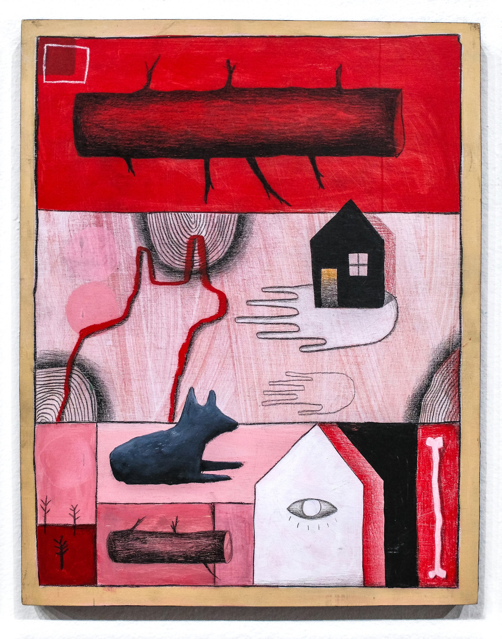 Acrylic, oil pastel, pencil, wax pastel. 14" x 11" , wood panel.