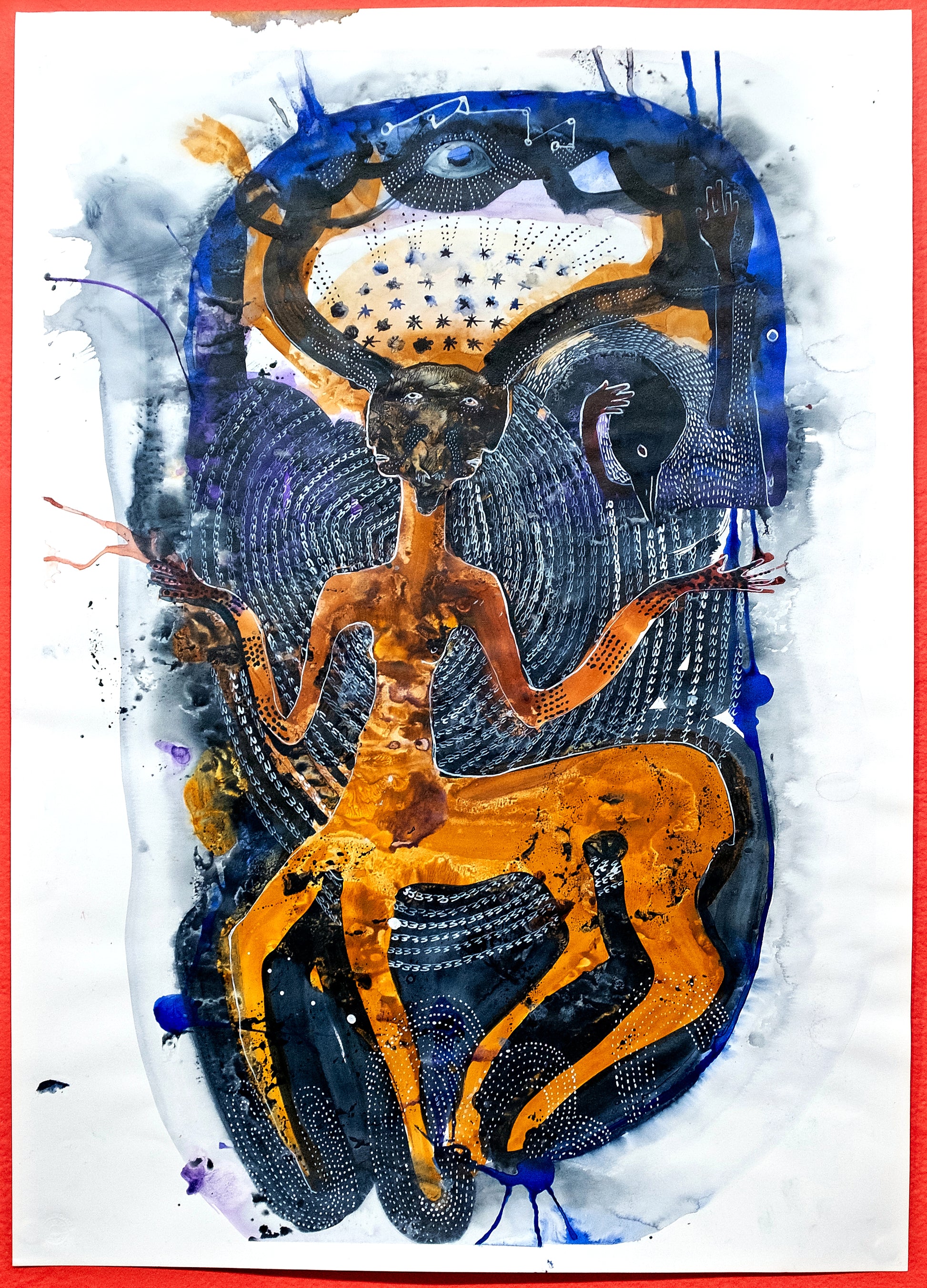 pigments, casein binder, watercolors, inks on art paper, 27.5" x 19.5"