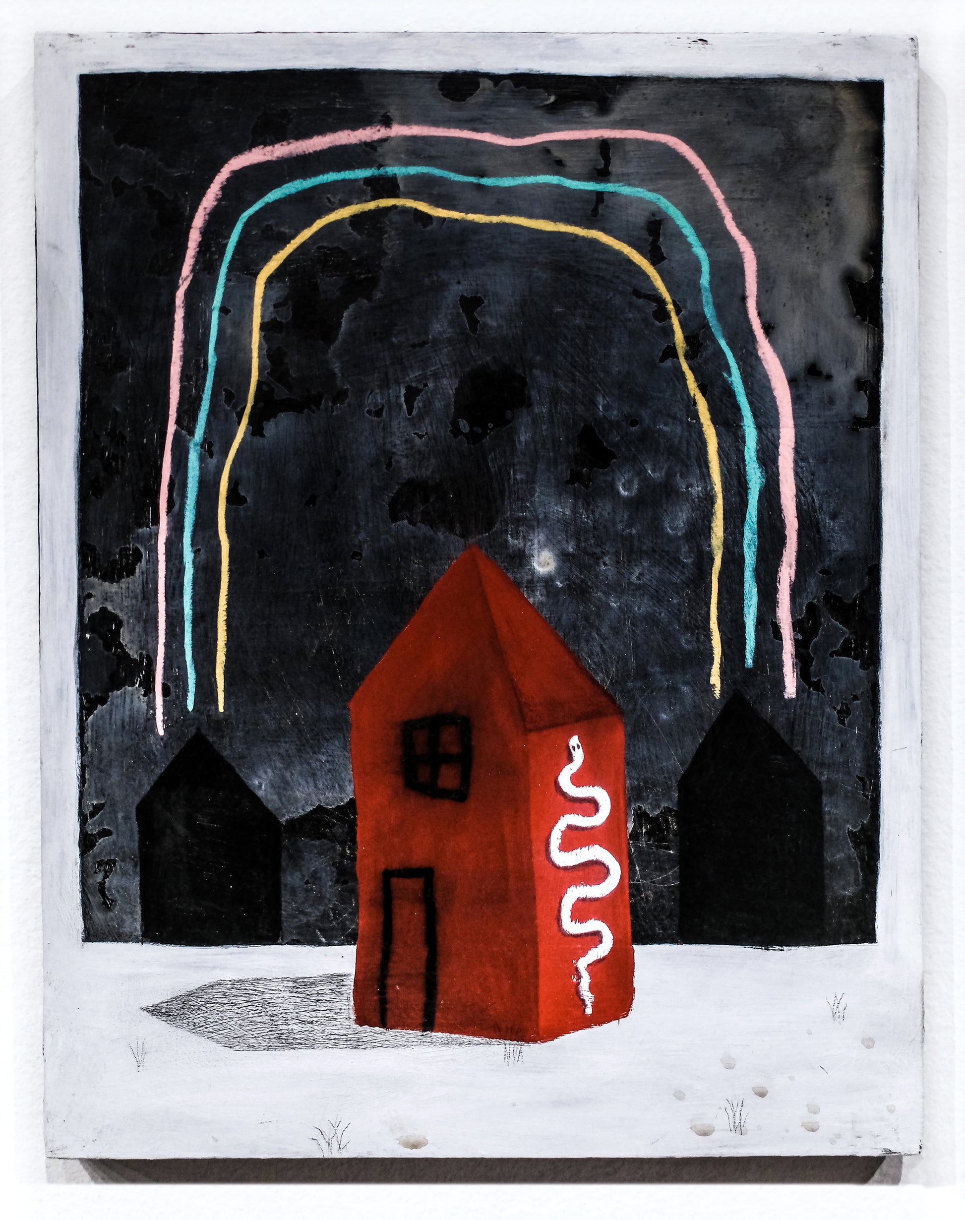 Acrylic, oil pastel, pencil. 14" x 11", wood panel.