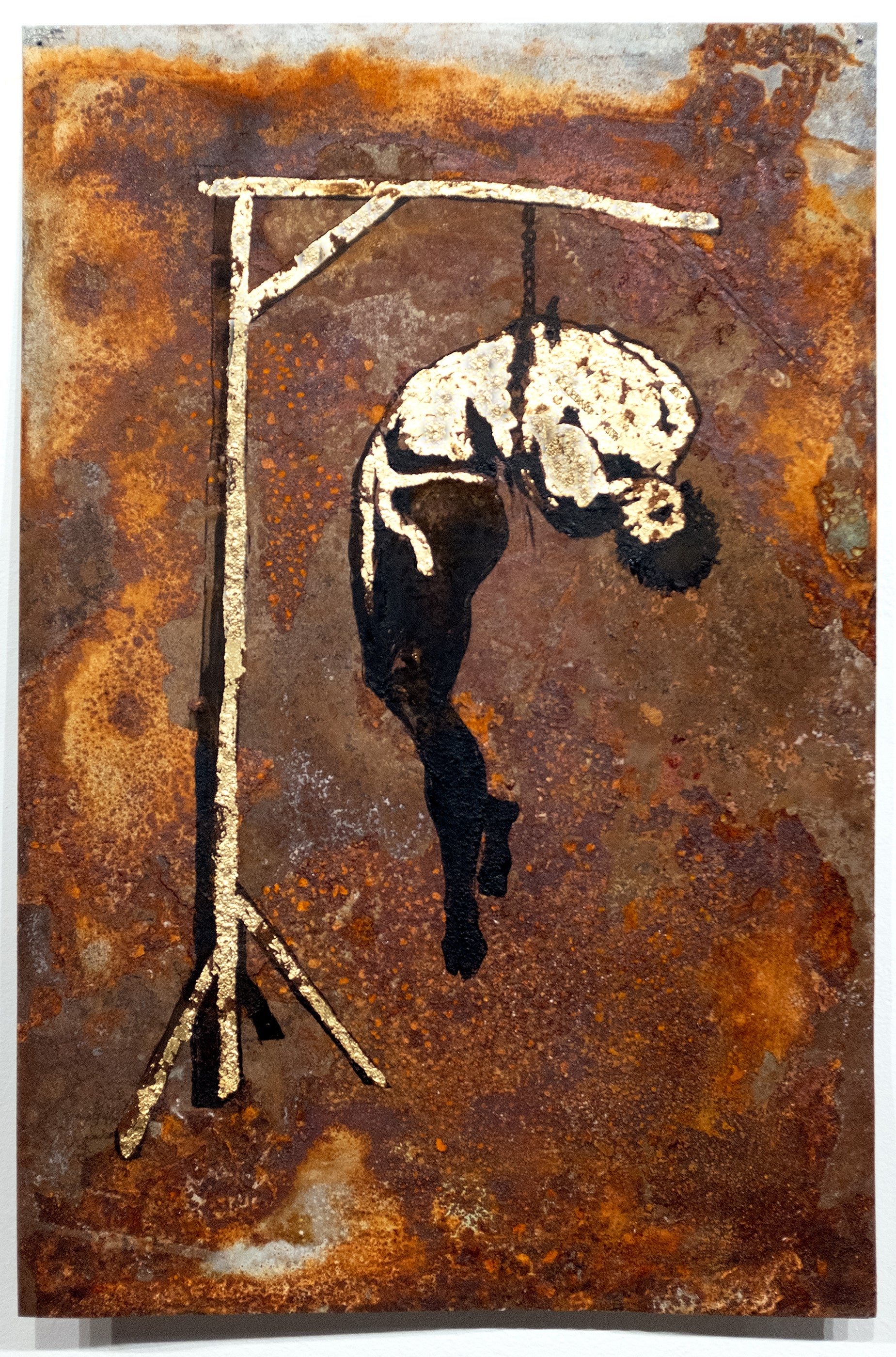 acrylic, ink, gold leaf on sheetmetal, 36" x 24"