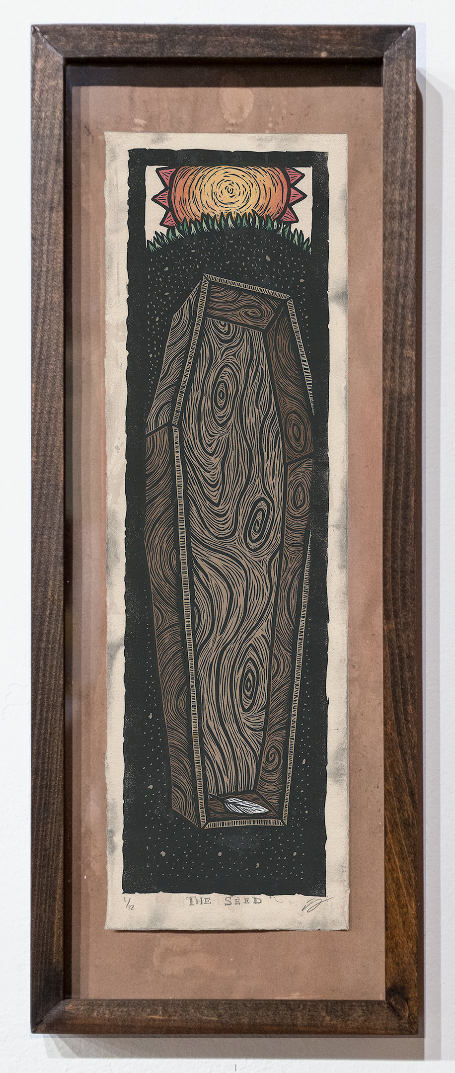 Hand carved woodblock print, hand painted with watercolor on tea treated cotton rag paper, 23.5" x 9”, custom frame, Edition of 12