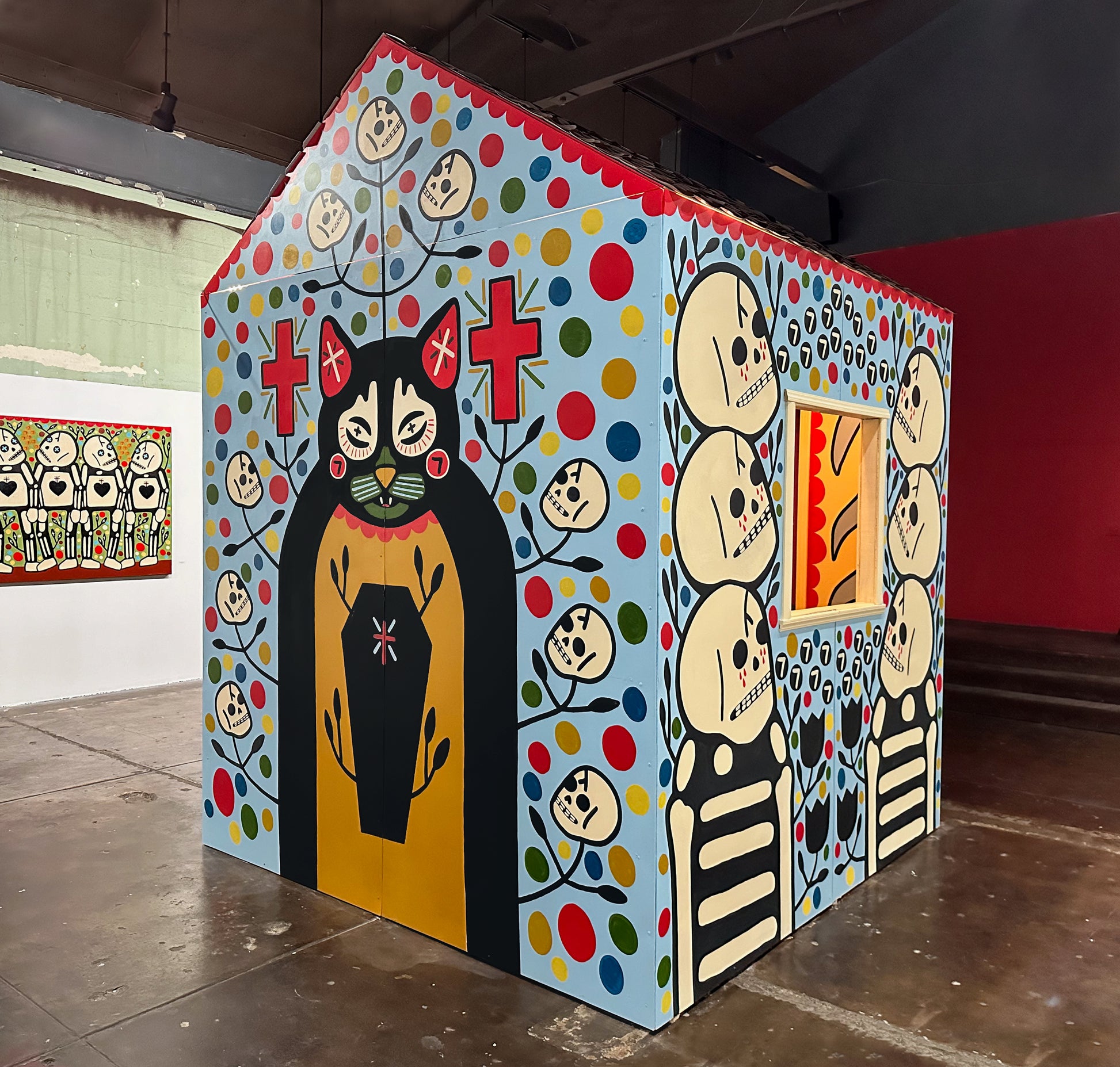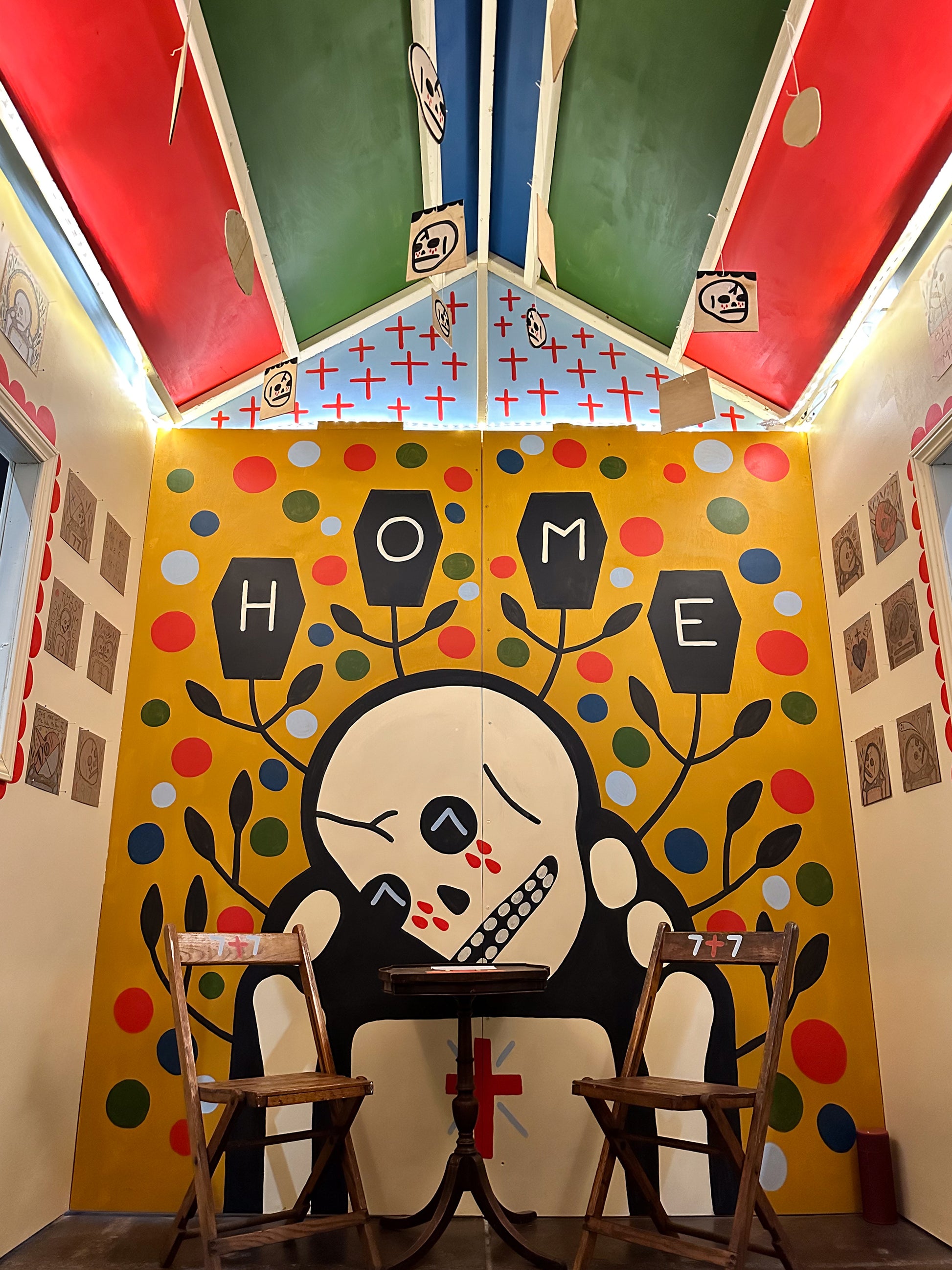 Custom built wood structure, site-specific interior and exterior murals, includes installation of drawings, paintings, found objects, 8' x 8' x 11'