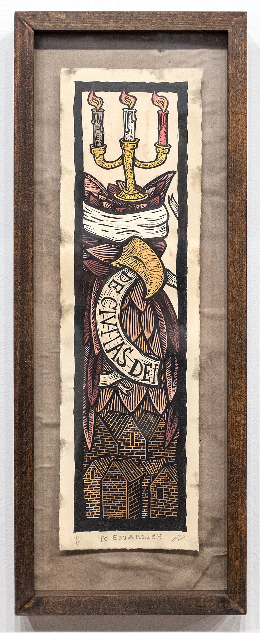 Hand carved woodblock print, hand painted with watercolor on tea treated cotton rag paper, 23.5" x 9”, custom frame, Edition of 12