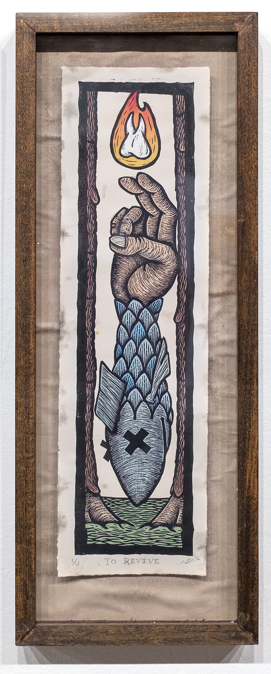 Hand carved woodblock print, hand painted with watercolor on tea treated cotton rag paper, 23.5" x 9”, custom frame, Edition of 12