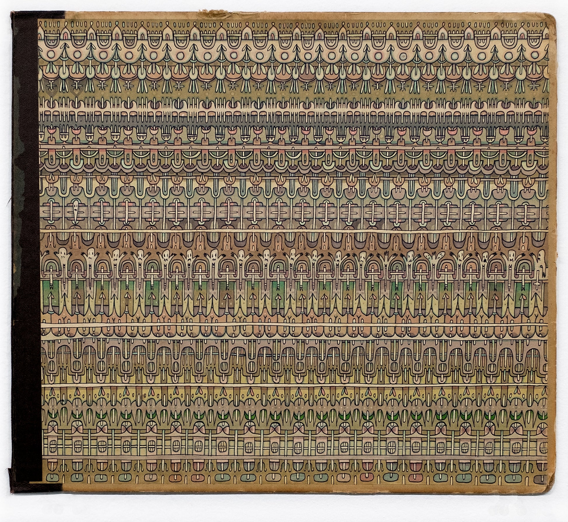 inks the artist mixes from dead pens and markers on vintage bookcover, 12.5 × 14 in